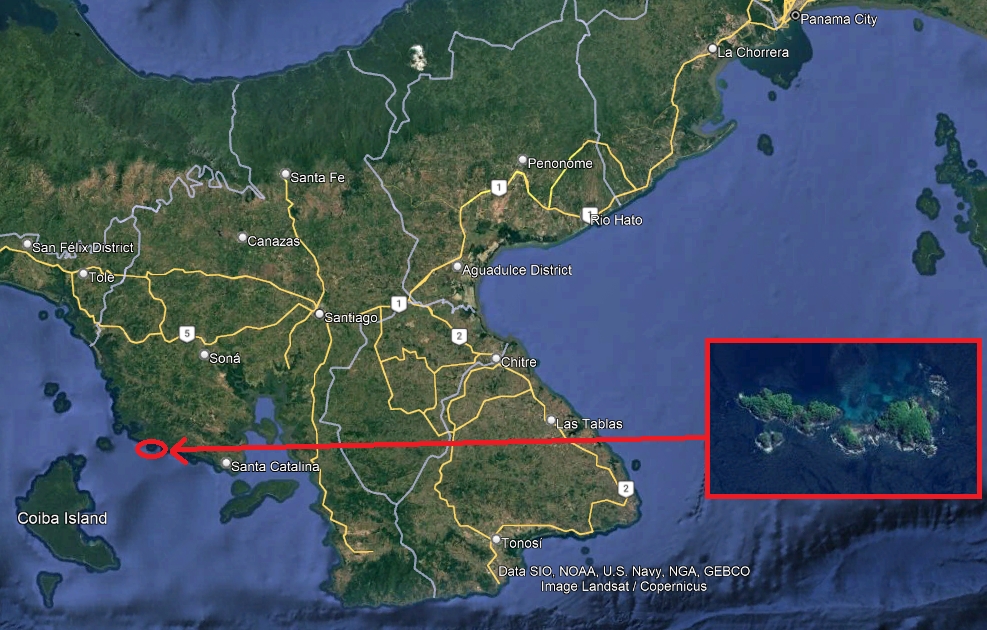 Cativo Islands (or Islotes de Cativo) are archipelago of few islands and rocks in Panama, Pacific part. Three Island’s combined area is 22,2 acres (9 hectares) and from one point from the first point of one island to the last point of the last there is around 985 m length, and 285m width. The maximum height is about 35m (according to elevation profile). The islands are close to each other, from 60 meters away and more.